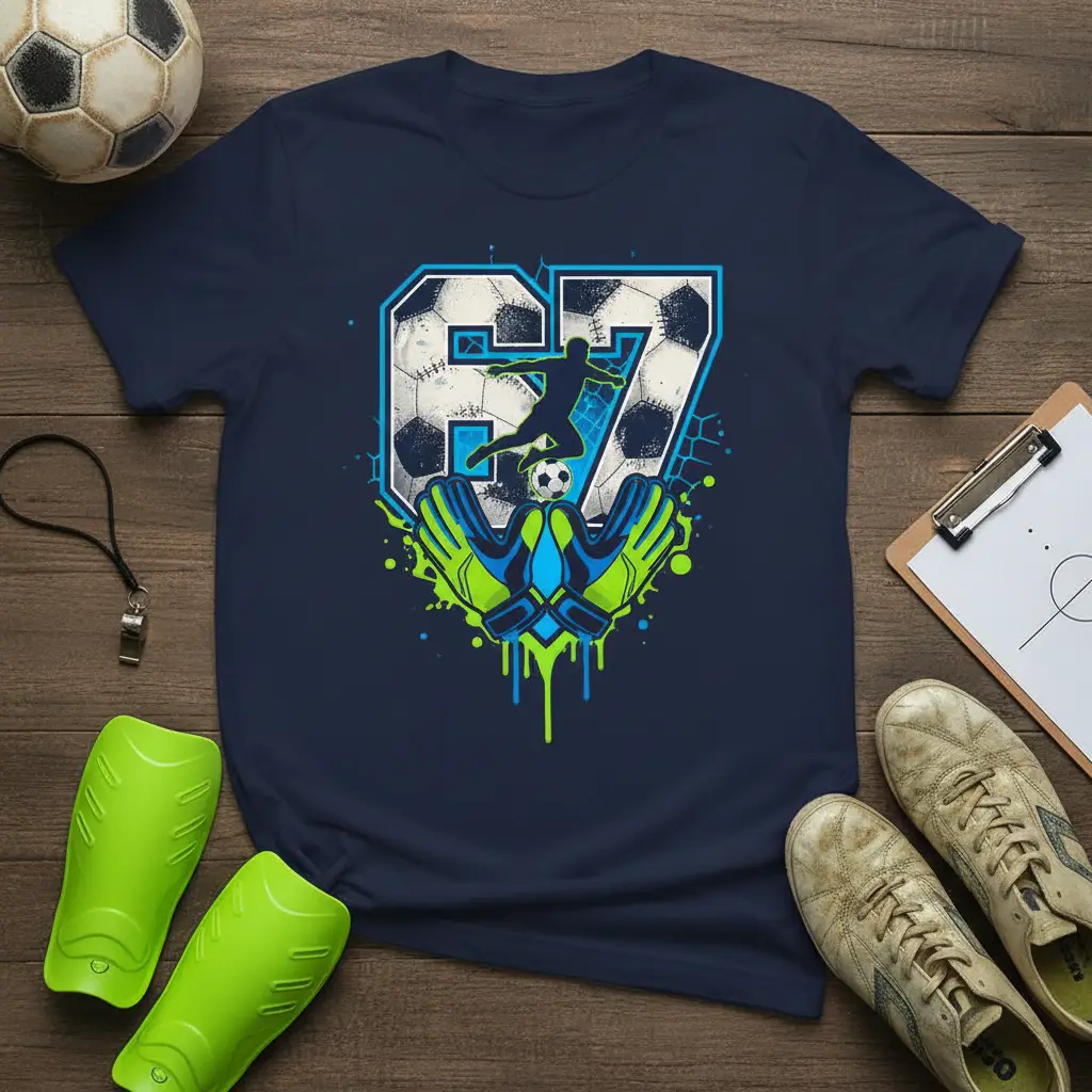 Embrace your inner goalkeeper with this uniquely designed “67” t-shirt. It features a dynamic graphic that includes a player silhouette in mid-action, perfectly complemented by vibrant goalie gloves and textured soccer balls. The artwork is enhanced with energetic splatter effects and bold outlines, creating a visually striking piece that embodies the spirit of the game.