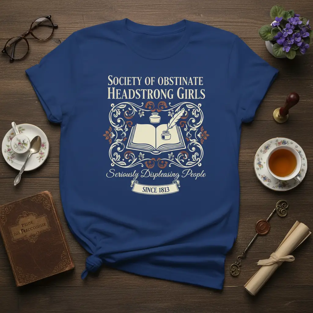 This unique t-shirt proudly displays the full quote, “SOCIETY OF OBSTINATE HEADSTRONG GIRLS Seriously Displeasing People SINCE 1813.” It’s an ideal way for any literature enthusiast or advocate for strong female characters to express their personality. The design is meticulously crafted to resonate with those who cherish classic novels and the powerful narratives they contain. Wear it as a badge of honor and connect with a community that values wit, intelligence, and a dash of rebellion.