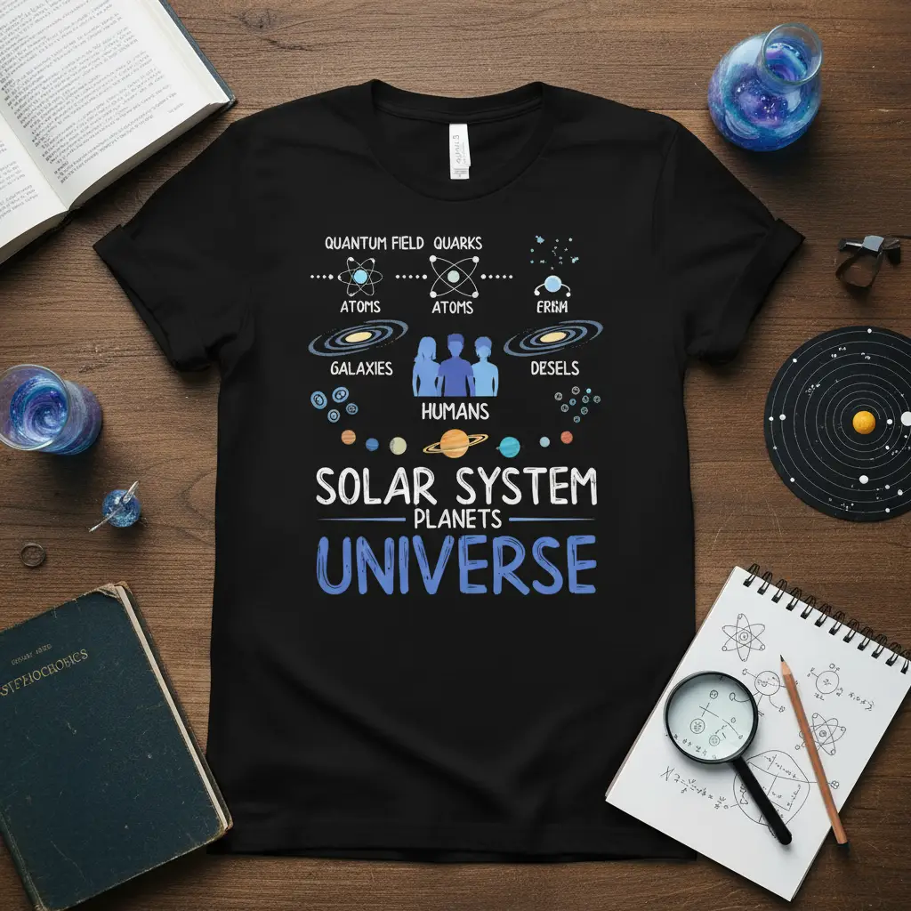 Solar System Planets Universe is beautifully depicted on this striking black t-shirt, making it a must-have for anyone captivated by the cosmos. This design delves into the fundamental building blocks of reality, from the smallest particles to the grandest celestial structures. It’s a wearable piece of art that sparks curiosity and conversation about physics, astronomy, and our place within the vast expanse of existence.