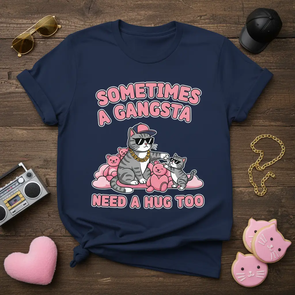 Sometimes A Gangsta Need A Hug Too, this phrase perfectly captures the adorable paradox of tough exteriors hiding soft hearts. This unique t-shirt design is a fantastic way to express that sentiment, featuring a cool cat that embodies both swagger and sweetness. It’s designed for those who appreciate a touch of humor and a whole lot of charm in their wardrobe. The eye-catching graphic and relatable quote make it a standout piece for any casual occasion, sparking smiles and conversations wherever you go.