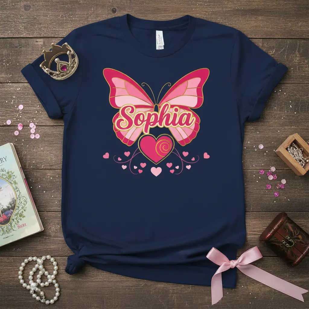 The name “Sophia” is rendered in an elegant, flowing script, adding a touch of sophistication to the playful design. The butterfly, with its layered pink wings and delicate gold trim, is a charming addition. This personalized touch makes the shirt incredibly special and a treasured keepsake.