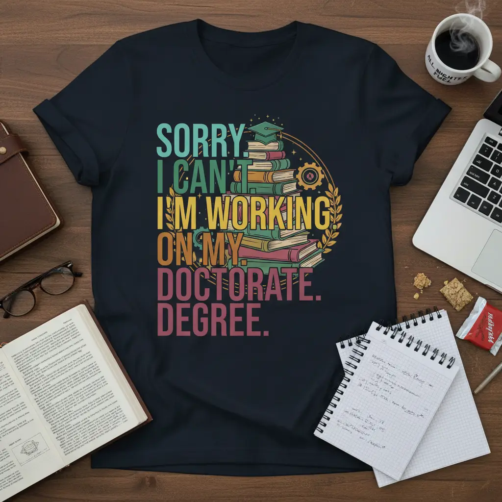 Sorry I Can’t I’m Working On My Doctorate. Degree. This statement tee is a perfect declaration for anyone deeply engrossed in their doctoral studies. It captures the dedication, focus, and sometimes overwhelming commitment required to earn that prestigious degree. The design features a vibrant, retro-inspired graphic that immediately conveys the message of academic pursuit. It’s more than just apparel; it’s a badge of honor for those on the challenging yet rewarding path to a doctorate.