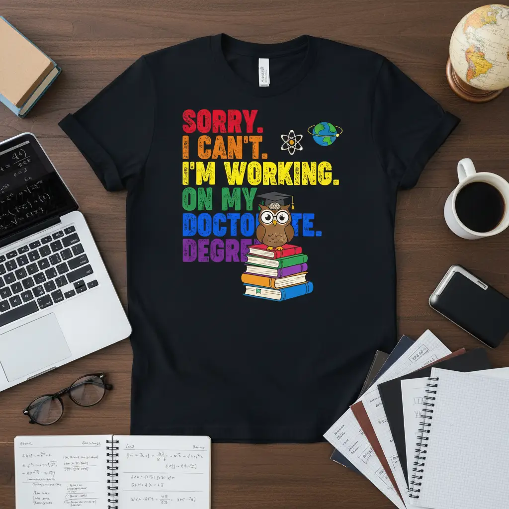 The owl graphic, combined with the “Sorry I Can’t” message, perfectly encapsulates the focused mindset of a doctoral candidate. It acknowledges the demanding nature of advanced studies while maintaining a positive and humorous outlook. This tee is an ideal way for students to express their commitment to their education and to share a bit of their academic journey with the world. It’s a testament to the hard work, perseverance, and intellectual curiosity that drives individuals to achieve the highest academic honors.