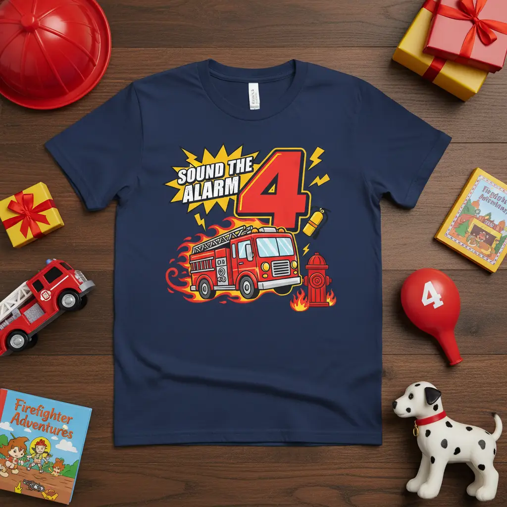 This eye-catching t-shirt celebrates a child’s fourth birthday with an exciting fire truck theme. The design prominently features the phrase “Sound the Alarm” alongside a dynamic illustration of a fire truck, complete with flames and a large number “4.” It’s an ideal choice for children who dream of being firefighters or simply love the thrill of emergency vehicles.