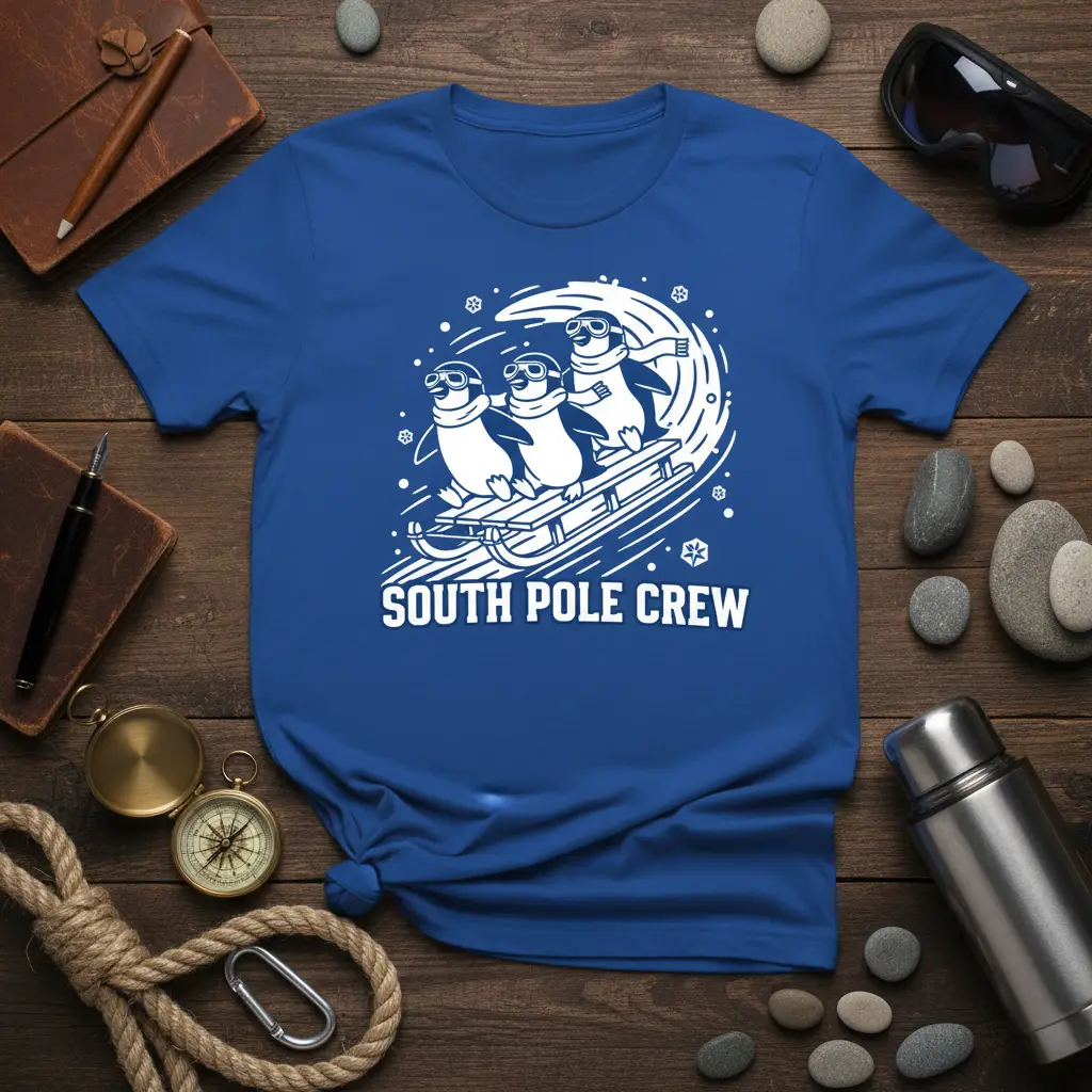 This captivating design brings the magic of the South Pole right to your wardrobe, showcasing a trio of penguins embarking on an exhilarating sled ride. The bold “SOUTH POLE CREW” text perfectly complements the playful illustration, creating a cohesive and eye-catching graphic. It’s an ideal choice for anyone who dreams of icy landscapes or simply enjoys a touch of whimsical charm in their apparel. The design is rendered in a clean, striking white against the vibrant blue fabric, ensuring it stands out with exceptional clarity and appeal.