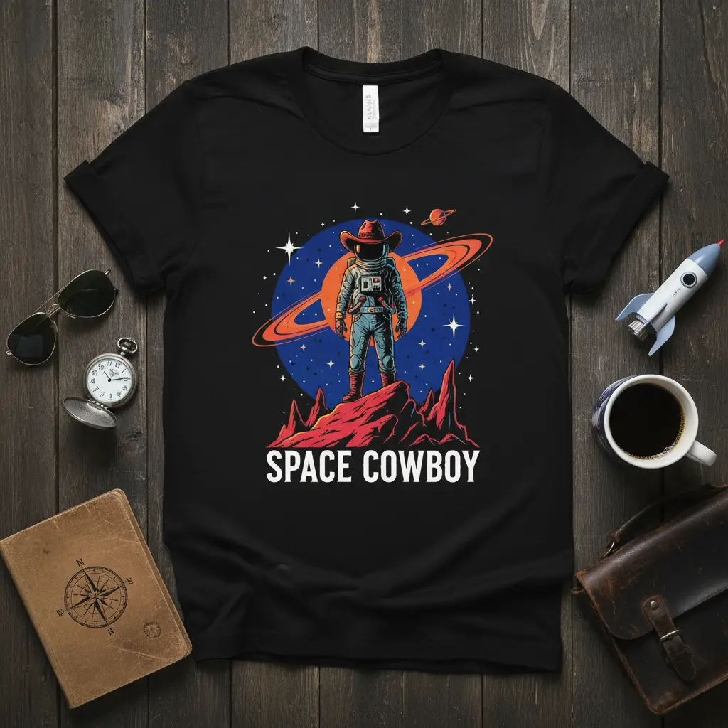 The phrase “SPACE COWBOY” is emblazoned below the graphic in clear, impactful lettering, reinforcing the theme. This makes it instantly recognizable and searchable for those seeking this specific niche. It’s an ideal choice for individuals who love to express their unique interests and passions through their clothing. Whether you’re a fan of space travel, Western culture, or simply appreciate quirky and creative designs, this tee is sure to become a favorite.