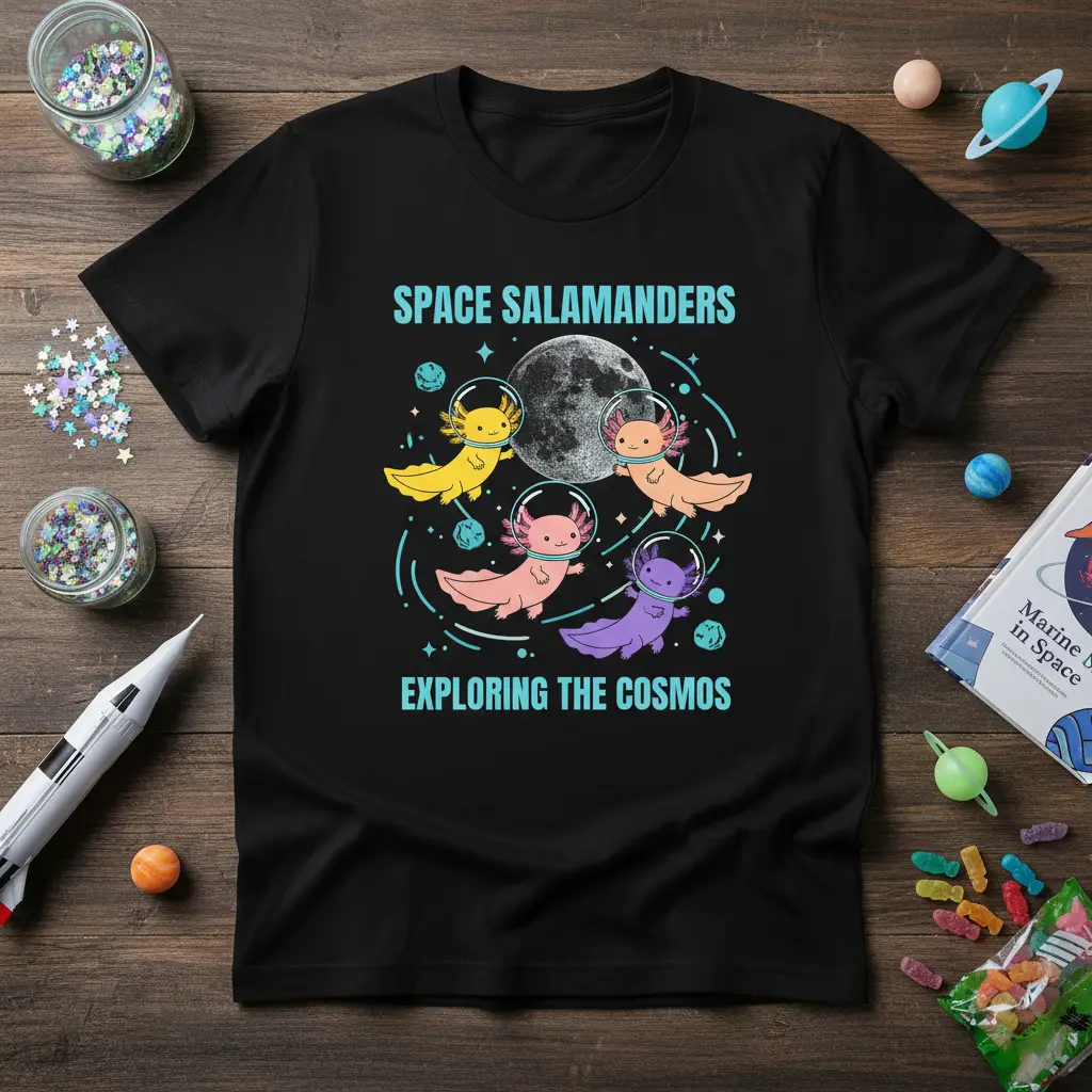 SPACE SALAMANDERS EXPLORING THE COSMOS text is boldly presented on this unique t-shirt, inviting you to a universe of fun and fascination. This design captures the imagination with its whimsical depiction of axolotls venturing through the vast expanse of space. It’s more than just apparel; it’s a statement piece for anyone who dreams of the stars and adores these charming aquatic creatures. Get ready to showcase your love for both axolotls and the mysteries of the cosmos with this eye-catching tee.
