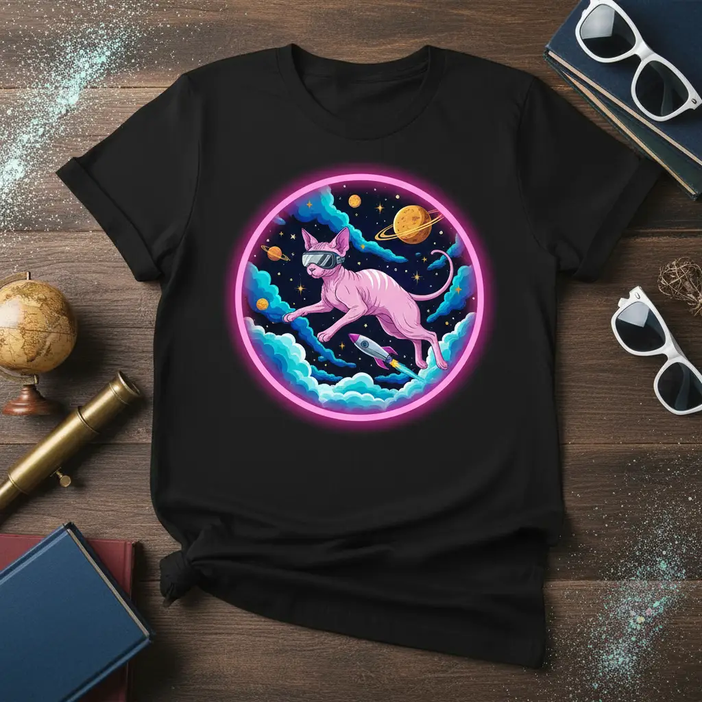 Embark on an unforgettable Sphynx Cat Space Adventure with this incredibly unique and eye-catching t-shirt. This design captures the imagination, featuring a pink Sphynx cat sporting sleek VR goggles as it navigates the vast expanse of space. Surrounded by vibrant nebulae, distant planets, and twinkling stars, the cat is depicted alongside a futuristic rocket, embodying a spirit of exploration and wonder. The bold neon pink outline adds a striking visual element, making this tee a perfect statement piece for any cat lover with a penchant for sci-fi and bold aesthetics. It’s more than just apparel; it’s a wearable piece of art that sparks conversation and celebrates individuality.
