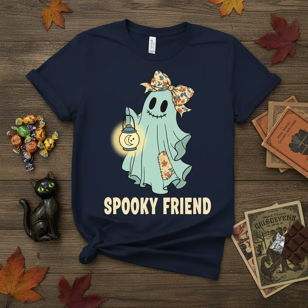 This Spooky Friend t-shirt is designed to be a comfortable and stylish staple for your fall wardrobe. The graphic features a playful ghost with a floral bow and a lantern, embodying the whimsical side of Halloween. It’s perfect for anyone who loves cute spooky designs and wants to share their festive spirit with the world. This shirt is more than just apparel; it’s a conversation starter and a fun way to celebrate your favorite season.