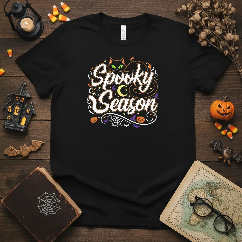 Celebrate the arrival of October and the thrill of Halloween with our vibrant “Spooky Season” t-shirt. This eye-catching design is perfect for embracing the festive atmosphere that sweeps through neighborhoods and hearts alike. It features a captivating black cat with piercing green eyes, nestled amongst playful pumpkins, fluttering bats, and a whimsical crescent moon, all rendered in a delightful, retro-inspired font. The blend of colors and imagery creates a truly unique and memorable piece for any Halloween enthusiast.