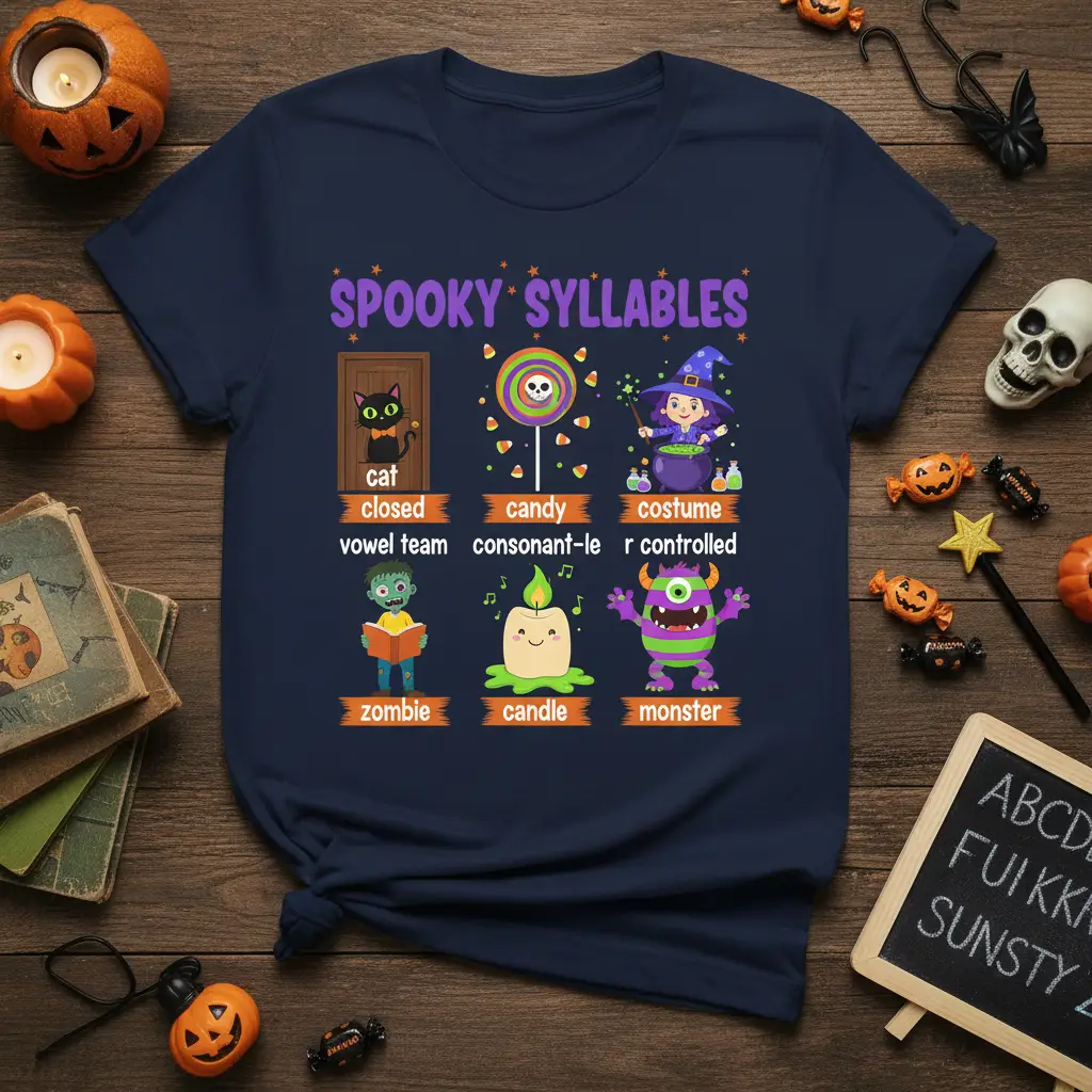 Children will be delighted by the whimsical characters and clear presentation of “Spooky Syllables.” This shirt transforms learning into a game, encouraging kids to identify and understand different syllable types through engaging visuals. The combination of popular Halloween themes and essential literacy skills makes it a fantastic choice for school events, parties, or just everyday wear.