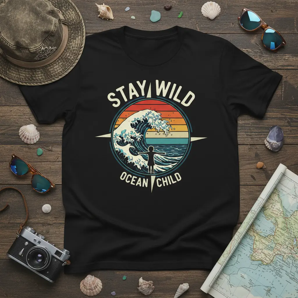 The central graphic on the Stay Wild Ocean Child t-shirt is a masterful depiction of a powerful wave, set against a vibrant, retro-inspired sunset. This visual narrative tells a story of courage, resilience, and the exhilarating dance between humanity and the sea. A small, silhouetted figure stands at the forefront, arms outstretched, seemingly embracing the vastness and power of the ocean. This imagery is a strong metaphor for living life fully and embracing the wild within.