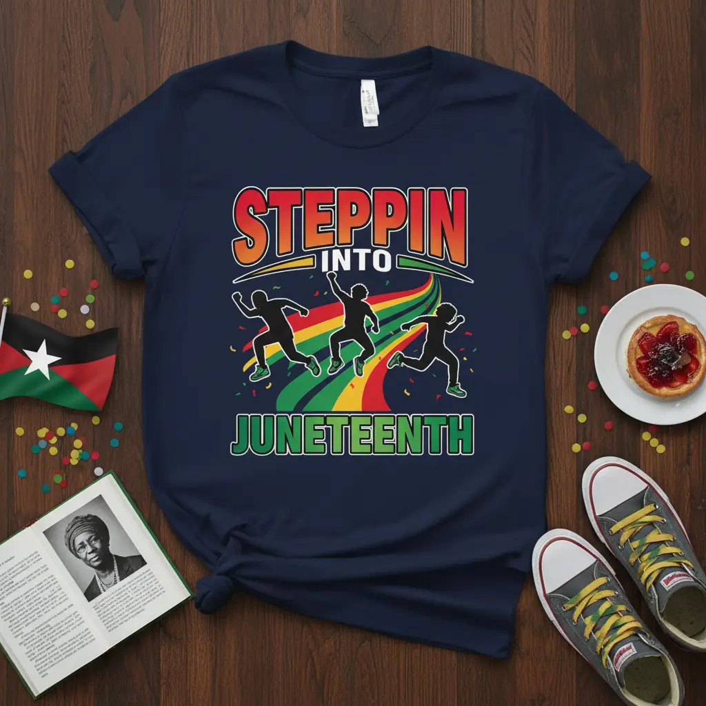 Pick from Black, Navy, Royal, Dark Heather, Red, and White to match your mood and wardrobe staples. Each colorway keeps the Steppin Into Juneteenth design clear and photo-ready for everyday wear.