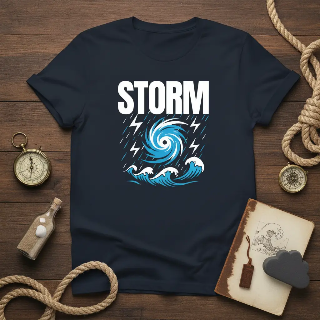 This eye-catching STORM T-Shirt features a prominent “STORM” graphic in crisp white lettering against a deep navy blue background. Beneath the bold text, a vibrant blue hurricane graphic is depicted in full force, showcasing its powerful spiral. The design is further enhanced by stylized lightning bolts and dynamic, crashing waves, all working together to create a visually stunning representation of a severe weather event. This detailed imagery speaks volumes to anyone who understands and respects the forces of nature.