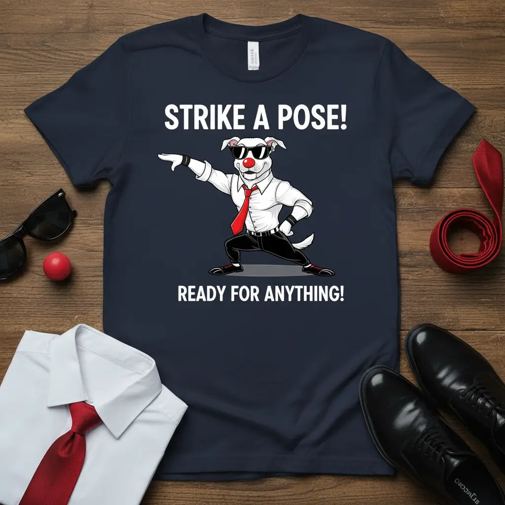 Strike a Pose Ready for Anything dog t-shirt is designed for the confident and the prepared, celebrating those who face life head-on with a sense of humor and undeniable style. This unique graphic tee features a charismatic pitbull dressed to impress, ready to tackle any challenge with flair. It’s more than just apparel; it’s a statement piece for dog owners who appreciate witty designs and want to showcase their love for their canine companions. The bold text and playful graphic create a memorable look that’s sure to turn heads and spark conversations wherever you go.