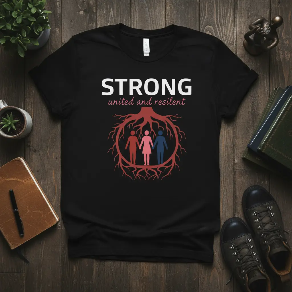 This striking graphic tee features the prominent declaration “STRONG united and resilient” set against a deep black background. Below the text, a beautifully rendered tree root system encircles three diverse figures, symbolizing the deep connections and mutual support that form the foundation of any strong community. The visual metaphor of roots signifies growth, stability, and the essential nourishment that binds people together, even through adversity.