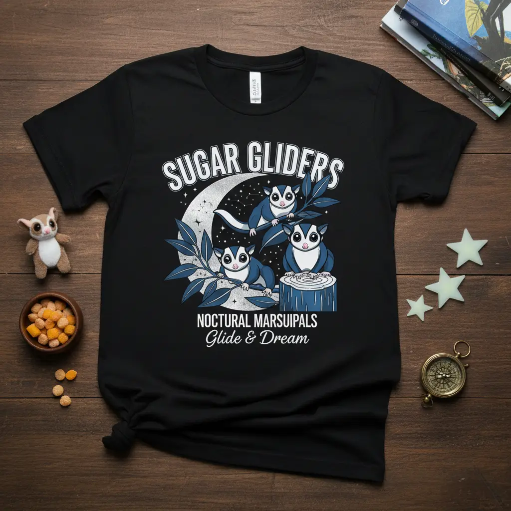 Each element of the design is carefully crafted to appeal to the senses and capture the essence of these beloved marsupials. The choice of colors and the whimsical artistic style create a harmonious blend that is both eye-catching and endearing. It’s a design that speaks to the heart, celebrating the gentle nature and gliding abilities of sugar gliders, inviting wearers to embrace their own dreams and aspirations.