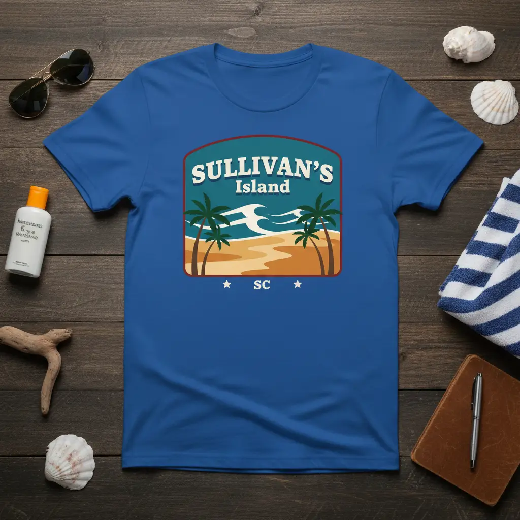 SULLIVAN’S Island SC proudly adorns this classic t-shirt, perfect for anyone who cherishes the beauty and spirit of this iconic South Carolina destination. This design captures the essence of a coastal paradise, featuring swaying palm trees, gentle ocean waves, and the unmistakable charm of island life. It’s more than just apparel; it’s a wearable memory of sun-drenched days and salty breezes. Whether you’re a local or a visitor, this tee serves as a constant reminder of the unique allure that makes Sullivan’s Island so special.
