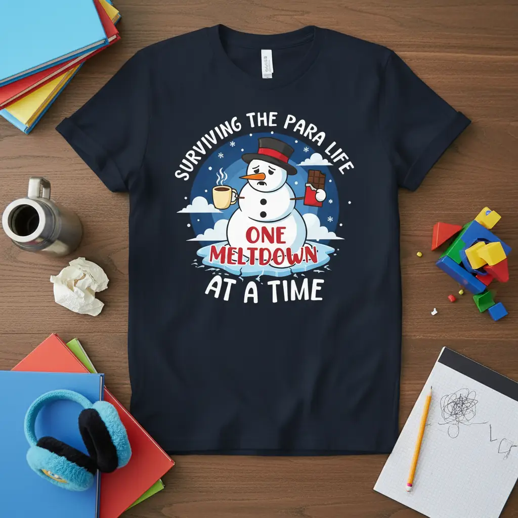 Being a paraeducator is a role filled with immense rewards and unique challenges. This “this design” design speaks directly to that experience, featuring a charming, albeit slightly stressed, snowman. He’s holding a comforting coffee and a piece of chocolate, symbolizing the small comforts that get you through the day. The surrounding icy landscape and falling snow add a touch of winter whimsy, making the design memorable and engaging.