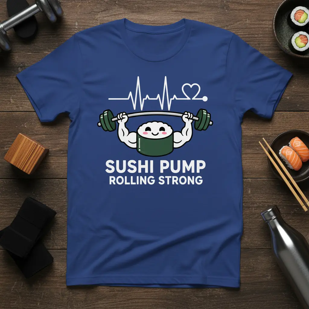 This eye-catching tee features a charming sushi roll character flexing its muscles while lifting a barbell, complete with a heartbeat line symbolizing a healthy lifestyle. The bold white text “SUSHI PUMP ROLLING STRONG” clearly communicates the wearer’s dual passion for fitness and sushi. It’s more than just a shirt; it’s a statement piece that celebrates the fusion of healthy eating and dedicated training.