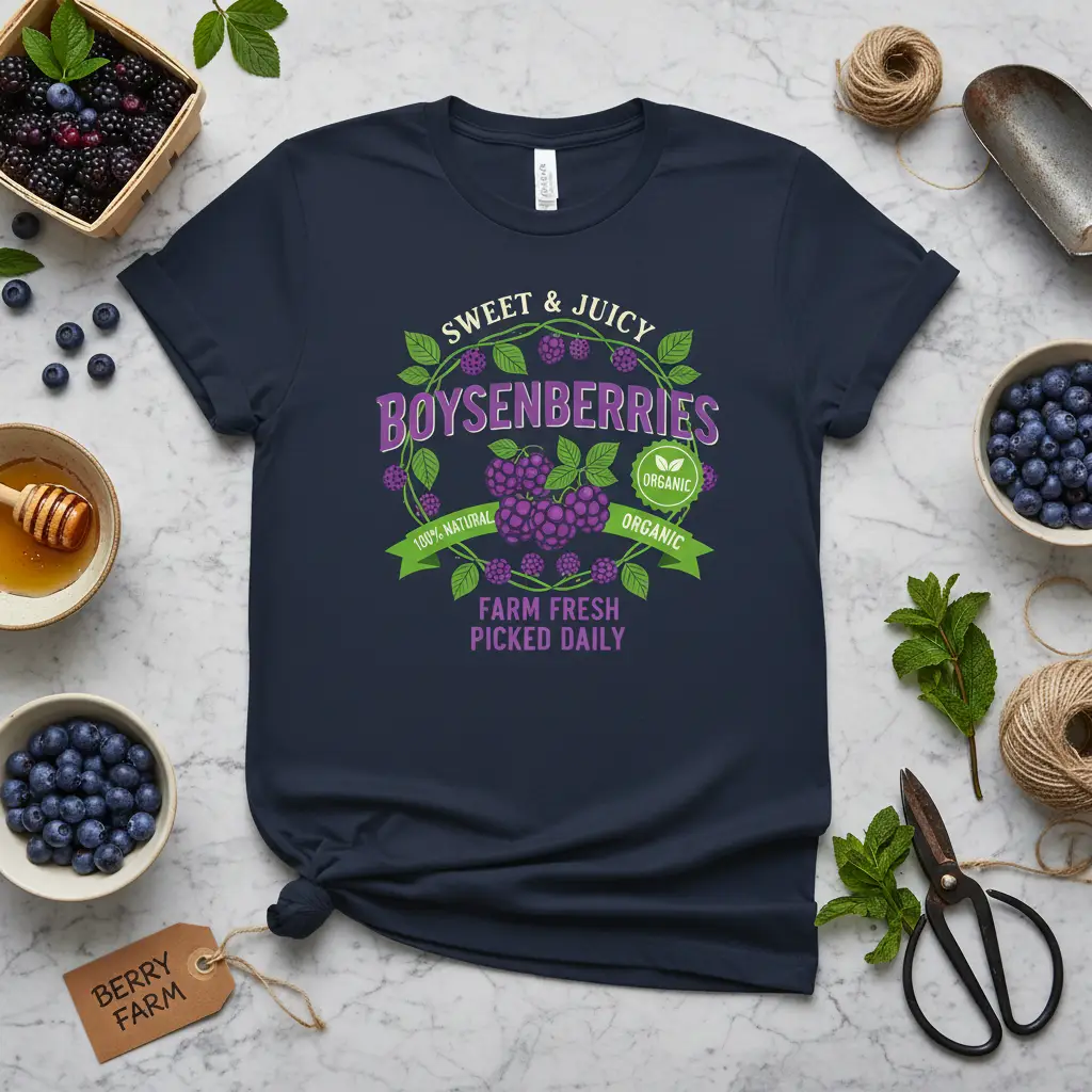 Complementing the eye-catching design are six classic color options to suit your personal style. Choose from timeless Black, deep Navy, vibrant Red, clean White, subtle Dark Heather, or striking Royal. Each color provides a distinct backdrop that makes the “SWEET & JUICY BOYSENBERRIES” graphic pop, allowing you to express your individuality while celebrating your love for organic produce.