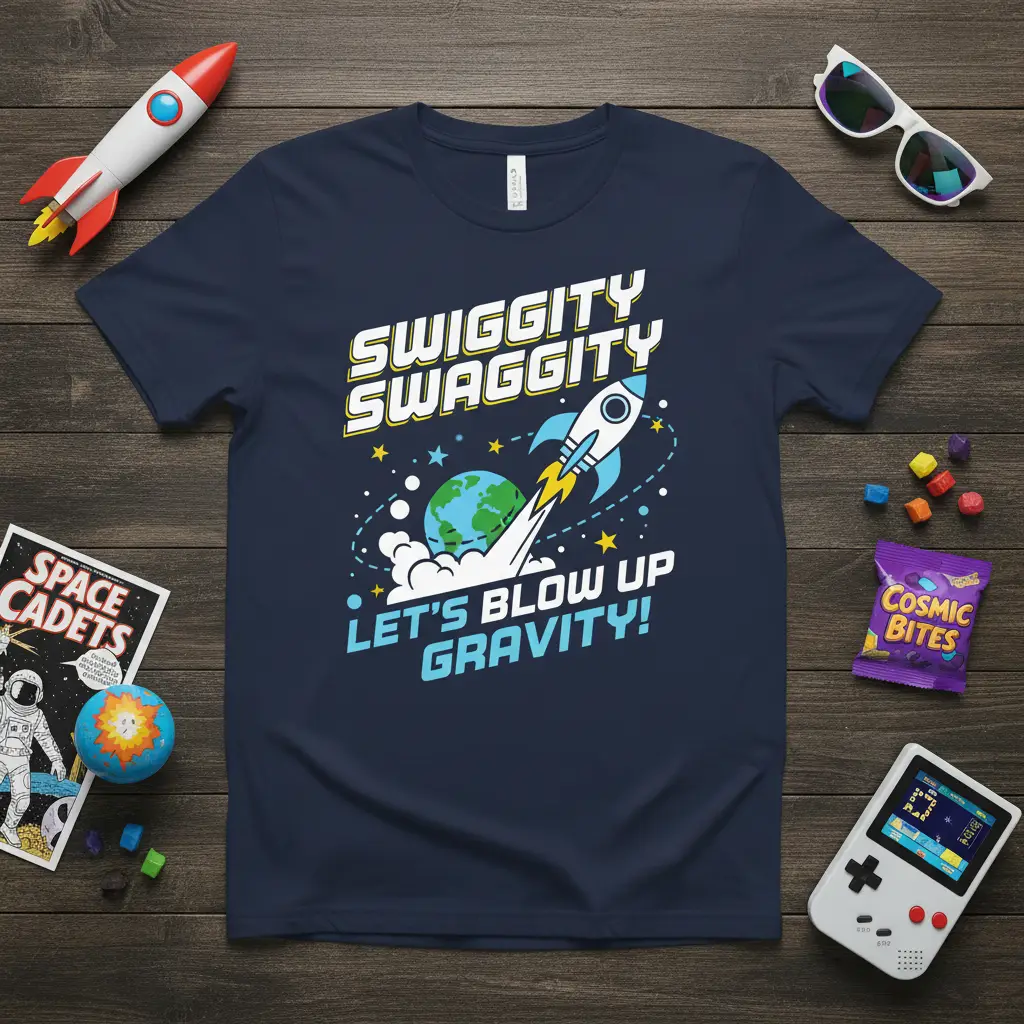 SWIGGITY SWAGGITY LET’S BLOW UP GRAVITY! This phrase perfectly encapsulates the adventurous spirit and playful humor found in this unique t-shirt design. Featuring a vibrant graphic of a rocket blasting off from Earth, it’s an ideal choice for anyone who loves space, science, or just a good dose of fun. The dynamic imagery and catchy slogan make it a standout piece for casual wear. Show off your cosmic enthusiasm and your appreciation for gravity-defying dreams with this eye-catching tee.