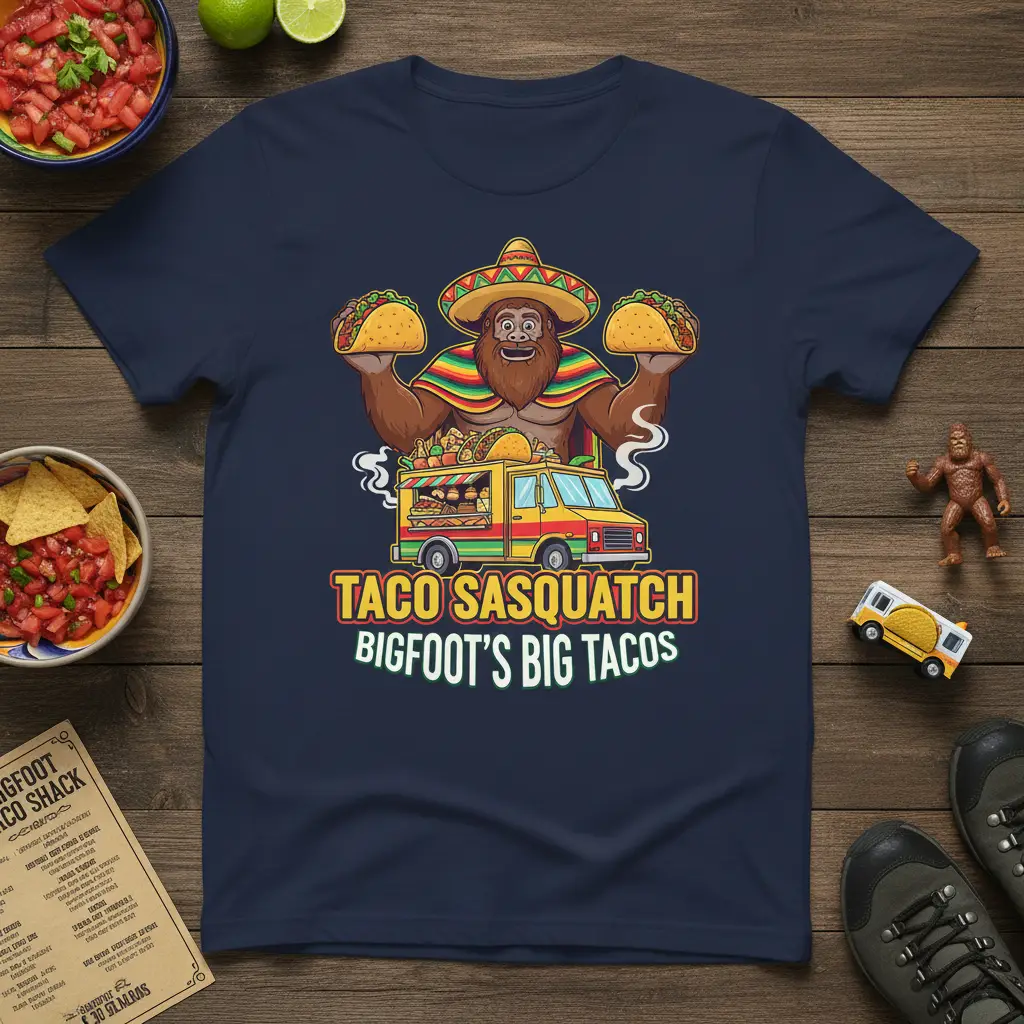 This captivating design brings to life the mythical creature we all know and love, Bigfoot, in a brand-new role as a master taco vendor. Imagine Bigfoot, adorned in a festive sombrero and a colorful poncho, expertly juggling two mouth-watering tacos. Beside him, a vibrant food truck, aptly named “Bigfoot’s Big Tacos,” is ready to serve up a storm of deliciousness. The bold lettering of “TACO SASQUATCH” and “BIGFOOT’S BIG TACOS” ensures the message is clear and humorous.