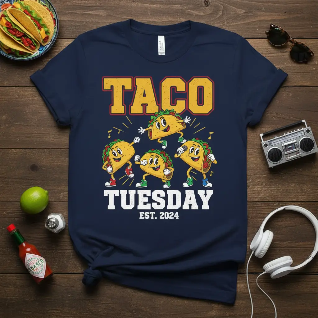 This eye-catching graphic tee is designed to bring a smile to your face and a rhythm to your step. The bold “TACO TUESDAY EST. 2024” lettering, rendered in a classic collegiate font, immediately grabs attention. Below it, a delightful illustration of dancing tacos adds a whimsical and energetic touch. Each taco character is full of personality, grooving to the beat with musical notes floating around them, embodying the sheer happiness that comes with indulging in your favorite Mexican fare.