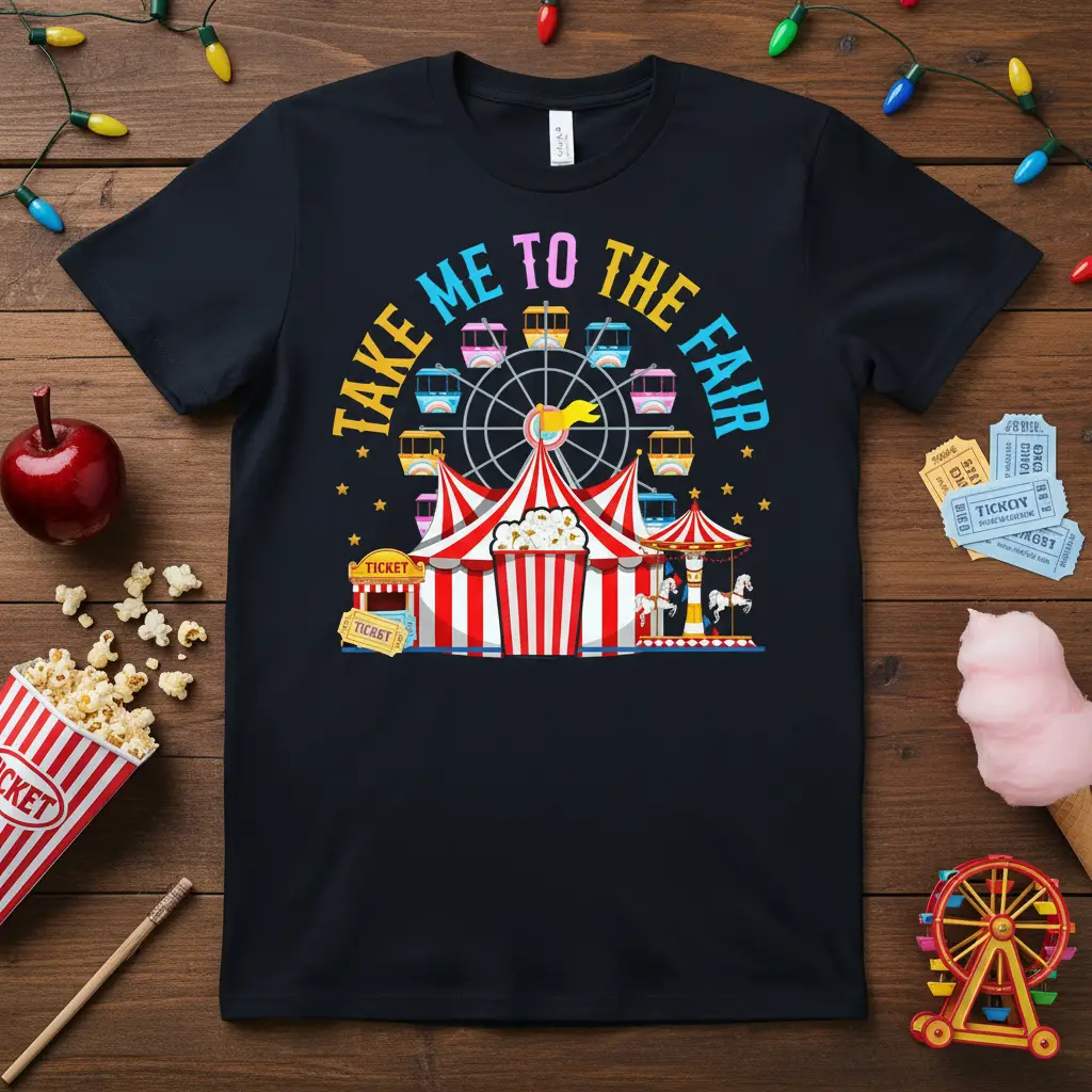 Take Me To The Fair is more than just a phrase; it’s an invitation to experience the magic and excitement of a classic carnival. This t-shirt design captures that feeling perfectly, bringing the vibrant energy of fairgrounds right to your wardrobe. Imagine the joy of a Ferris wheel ride, the allure of carnival games, and the sweet taste of popcorn, all encapsulated in one eye-catching graphic. It’s perfect for anyone who believes that life is better with a little bit of fairground fun and adventure. Embrace the spirit of summer and festive occasions with this delightful apparel.