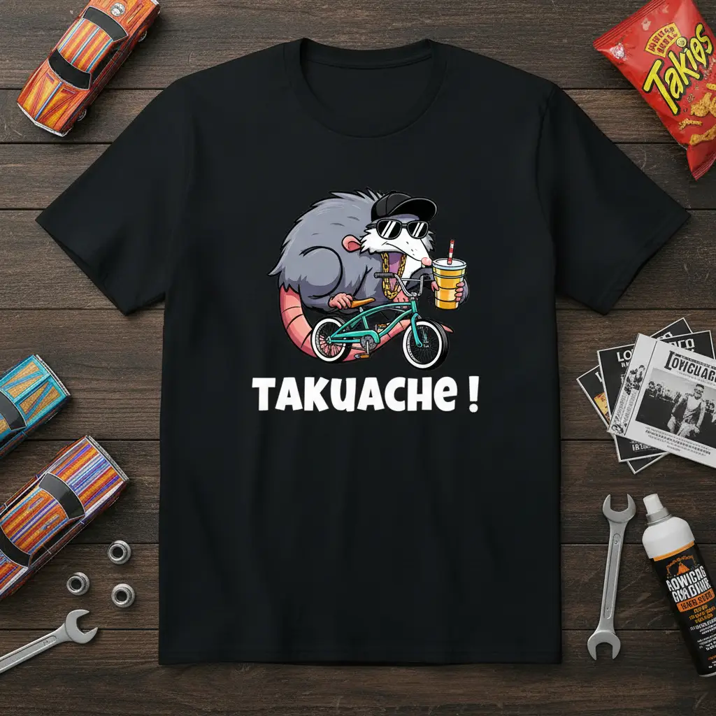 Forget boring basics; this TAQUACHE ! shirt offers a fresh and fun alternative. The artistic rendition of the opossum on a bike is both amusing and stylish, appealing to a wide audience who appreciate bold and quirky graphics. It’s a celebration of personality and a nod to modern internet culture, making it a must-have for collectors of unique apparel.