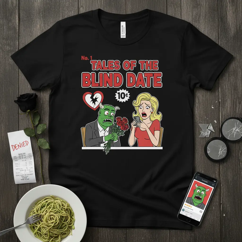 This No. 1 Tales of the Blind Date T-Shirt hilariously captures the awkwardness of modern dating with a quirky monster and human scenario. Crafted for comfort and durability, it’s the perfect conversation starter for anyone with a sense of humor about relationships and blind dates. A great gift for friends who love a good laugh.