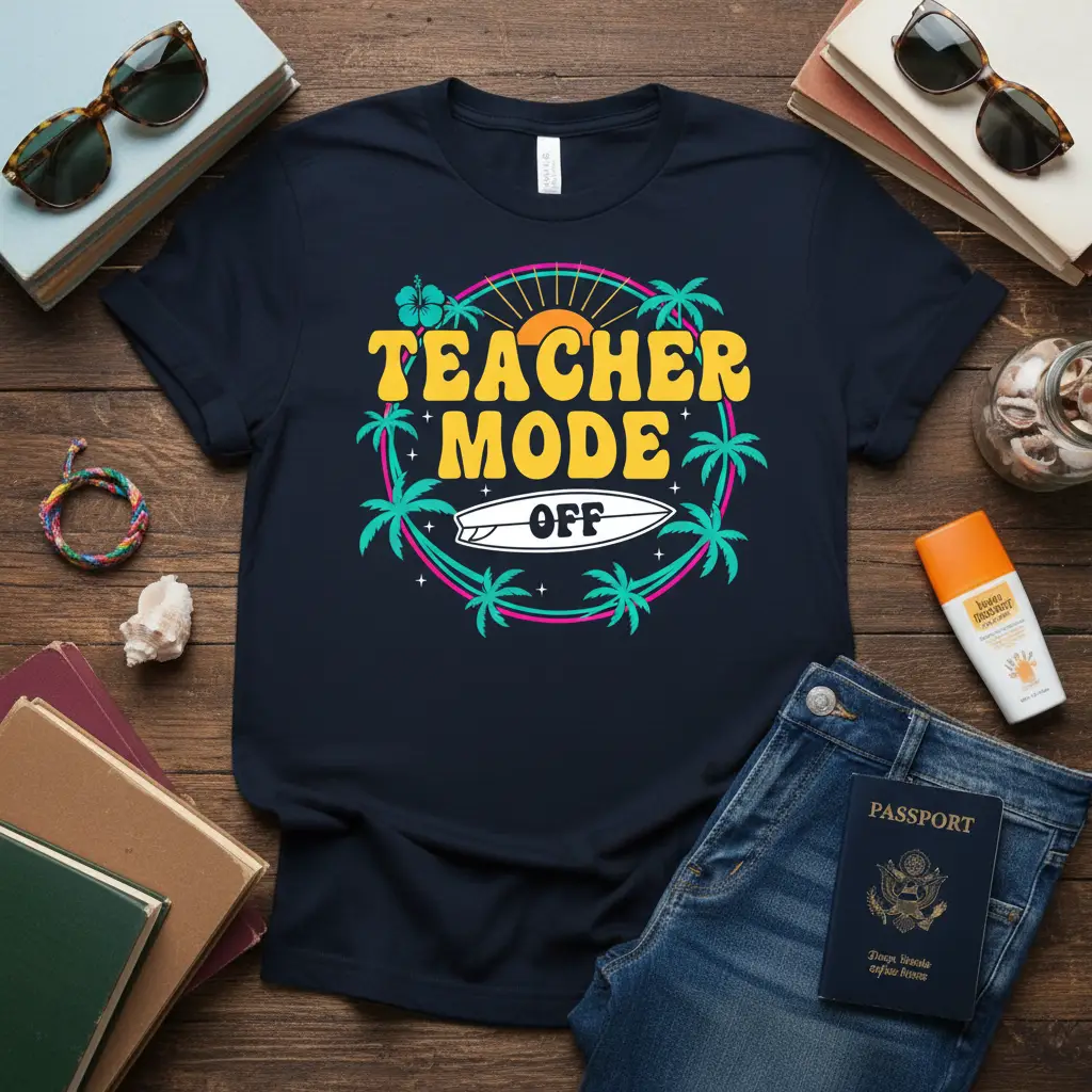 The phrase “Teacher Mode Off” resonates with educators everywhere, symbolizing a time for personal rejuvenation and enjoyment. Whether you’re planning a beach trip, a road trip, or simply enjoying time at home, this tee is a constant reminder to embrace the relaxation. It’s crafted for comfort, ensuring you feel as good as you look while you’re off the clock.