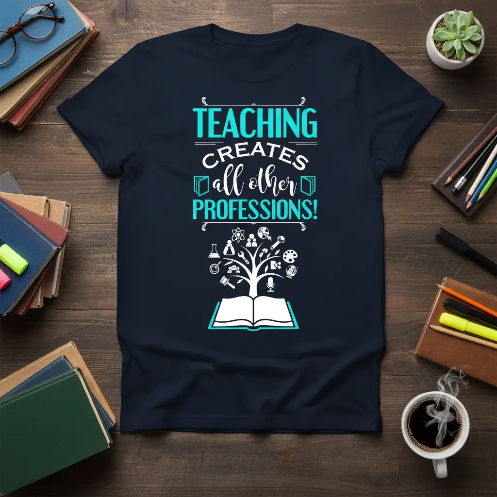 The crisp typography and clear message make this design stand out. It’s perfect for wearing during teacher appreciation events, back-to-school nights, or simply as a daily expression of pride in the teaching profession. This TEACHING CREATES all other PROFESSIONS! design is designed to be a conversation starter, sparking meaningful dialogue about the impact of education.