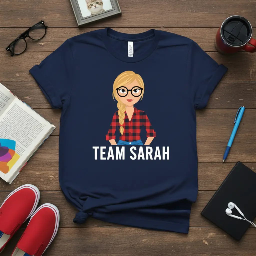 This “TEAM SARAH” t-shirt is crafted for comfort and style, making it an ideal choice for everyday wear. The design features a charming cartoon illustration of a woman who embodies the spirit of Sarah, complete with glasses and a fashionable plaid shirt. It’s a visual representation of the unique bond shared by those who rally around Sarah. This tee is perfect for any occasion where you want to highlight your connection to Sarah and her amazing group.