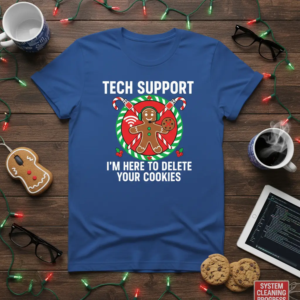 TECH SUPPORT I’M HERE TO DELETE YOUR COOKIES is more than just a witty phrase; it’s a holiday declaration for the unsung heroes of the digital world. This t-shirt captures the essence of IT humor, blending festive cheer with the relatable struggle of managing digital clutter. It’s designed for those who spend their days troubleshooting, debugging, and occasionally wrestling with problematic code, making it the perfect conversation starter at any holiday gathering or office party. Show your appreciation for the tech wizards in your life with a gift that’s both humorous and incredibly relevant to their daily grind.