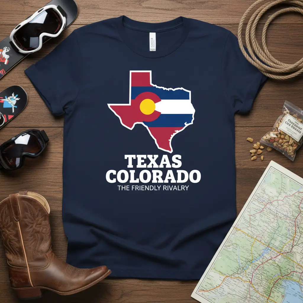 This Texas Colorado t-shirt is more than just clothing; it’s a celebration of shared experiences and distinct identities. This TEXAS COLORADO THE FRIENDLY RIVALRY design perfectly encapsulates the spirit of “The Friendly Rivalry,” making it a must-have for anyone who loves Texas and Colorado. Order yours today and wear your pride on your sleeve, ready to engage in some lighthearted banter!