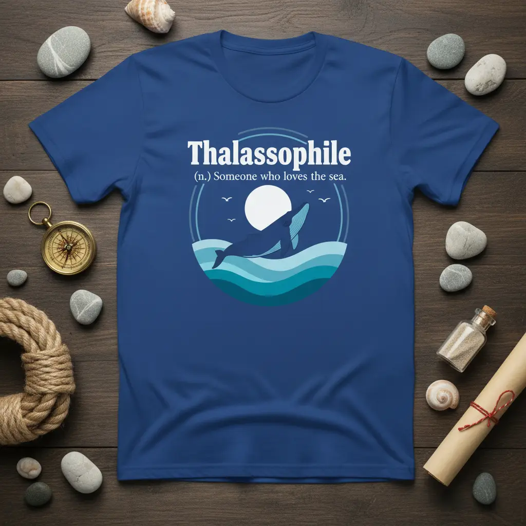 This unique t-shirt proudly displays the term “Thalassophile,” defining it as “(n.) Someone who loves the sea.” This Thalassophile Someone who loves the sea design is a visual ode to the ocean, featuring a beautifully illustrated whale breaching amidst stylized waves under a radiant sun. This imagery evokes a sense of freedom, wonder, and the sheer majesty of marine ecosystems. It’s crafted for individuals who find solace, joy, and inspiration in the aquatic world, making it a standout piece in any wardrobe.
