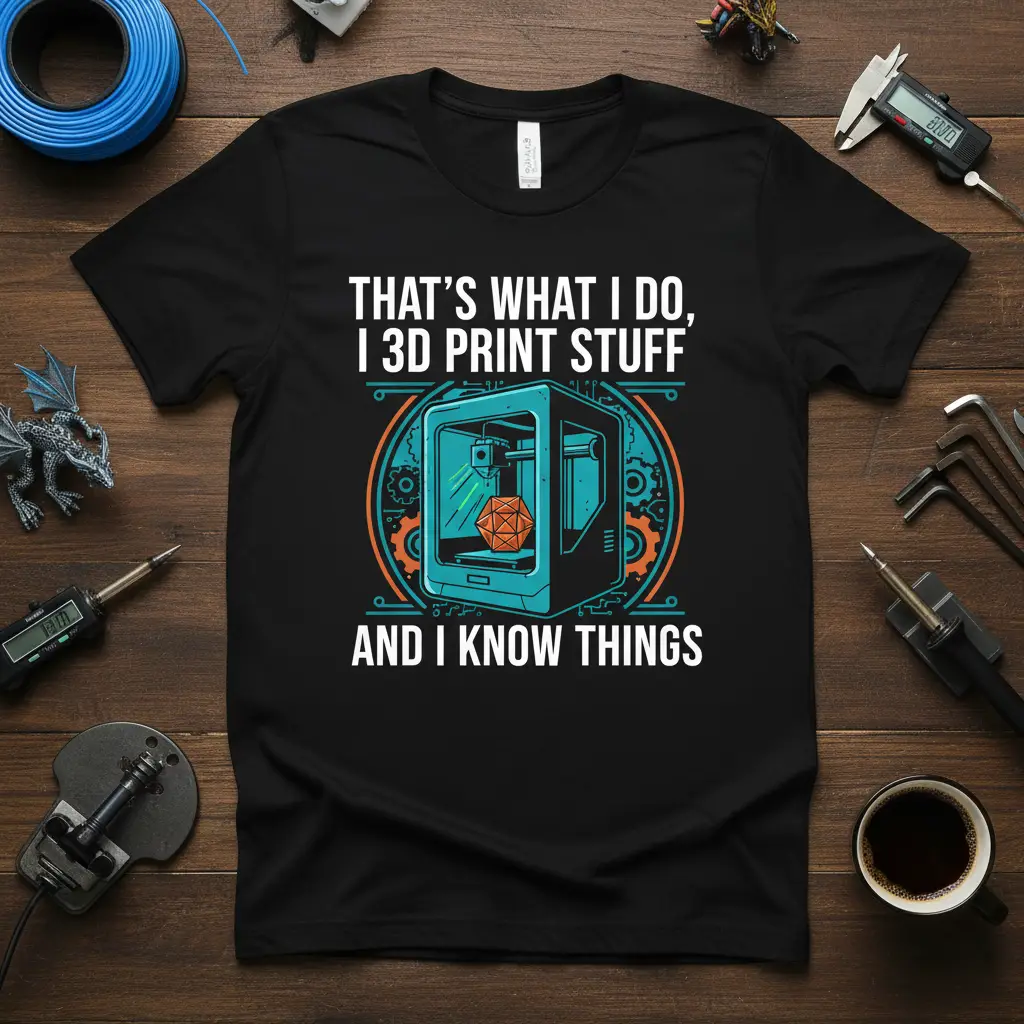 THAT’S WHAT I DO, I 3D PRINT STUFF AND I KNOW THINGS. This statement t-shirt is designed for the passionate creator, the tech enthusiast, and anyone who finds joy in bringing ideas to life through the magic of 3D printing. It’s more than just apparel; it’s a declaration of your skills and your love for innovation. The design combines witty text with a striking graphic of a 3D printer in action, making it a perfect conversation starter and a comfortable way to express your hobby. It’s the ideal gift for yourself or the 3D printing aficionado in your life.