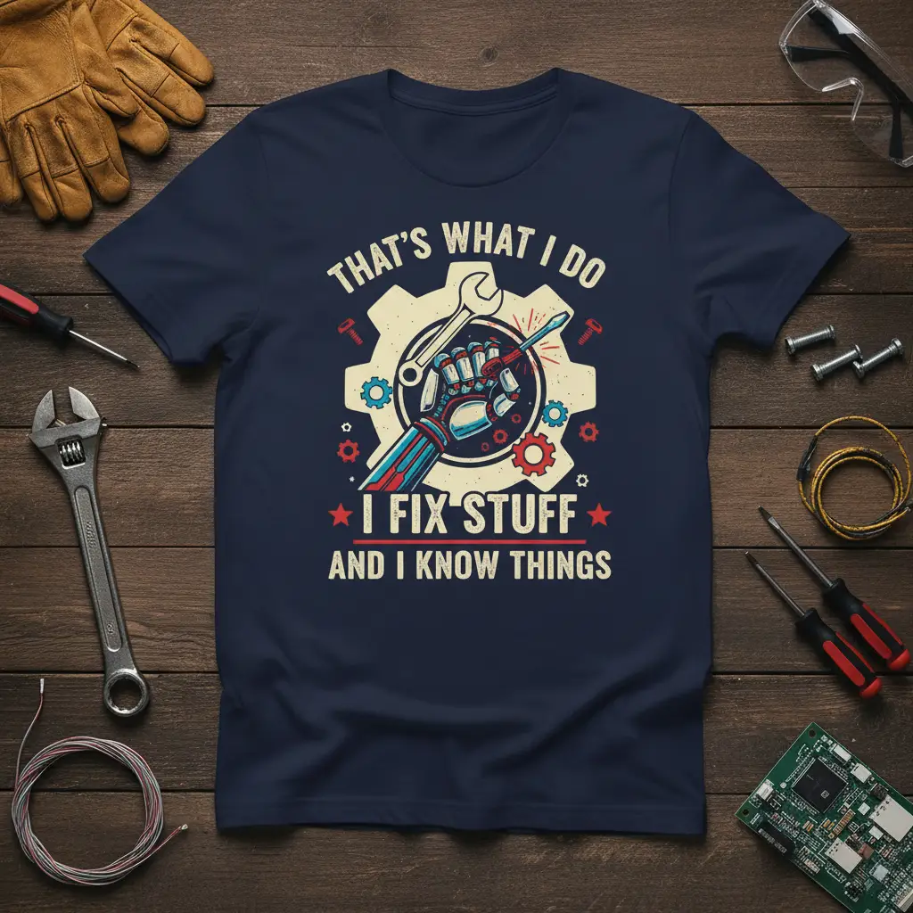 Don’t miss out on the opportunity to own or gift this exceptional t-shirt. It’s the perfect way to celebrate the fixer and thinker in your life. Order now and let the world know that you fix stuff and you know things. This shirt is an essential addition for anyone who takes pride in their skills and intelligence, making it a standout piece in any casual collection. Add this unique tee to your cart and wear your expertise with pride!