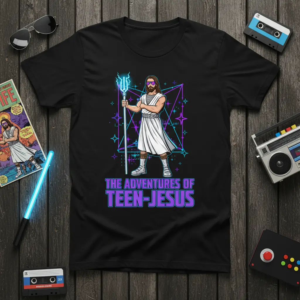 This eye-catching t-shirt features the full phrase “THE ADVENTURES OF TEEN-JESUS” in a striking, retro-inspired font. The accompanying graphic is equally captivating, presenting a stylized and cool rendition of Jesus, complete with sunglasses and a modern twist on traditional attire. He confidently holds a glowing trident staff, surrounded by geometric patterns and sparkling stars, all contributing to its distinct 80s or 90s vibe. It’s a design that appeals to fans of unique graphic tees and those who enjoy a playful take on religious and historical figures.
