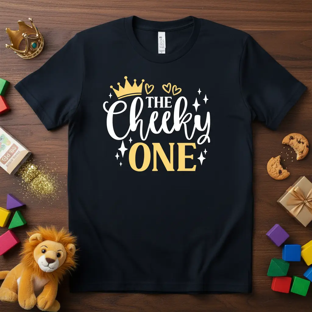 The “THE Cheeky ONE” design is thoughtfully created for babies turning one. Featuring a cheerful crown and sparkling accents, it announces to the world that your little one is officially “the cheeky one.” This shirt is guaranteed to be a hit at any party, making your child the star of the show.