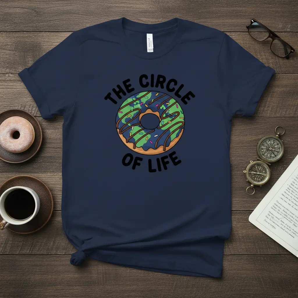 This tee proudly displays “THE CIRCLE OF LIFE” in bold, black lettering, encircling a vibrant donut graphic. The donut itself is creatively designed to resemble the planet Earth, complete with swirling green landmasses and blue oceans, all topped with colorful sprinkles that add a festive touch. This clever visual metaphor is sure to resonate with fans of food puns and unique artistic interpretations.