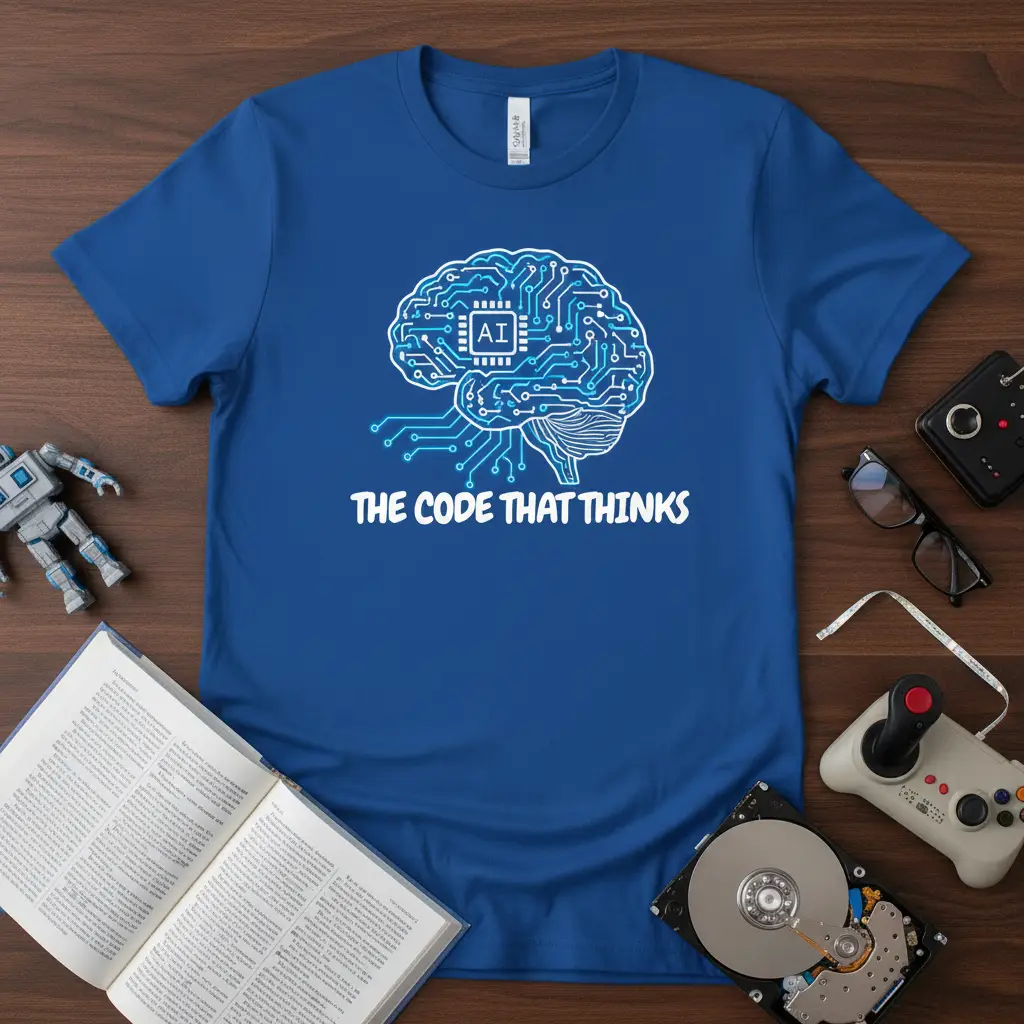 This unique t-shirt features a striking graphic of a brain composed of intricate circuitry, with the text “THE CODE THAT THINKS” emblazoned below. It’s a visual representation of how code forms the very foundation of artificial intelligence and advanced computing. The design speaks to the intricate processes and logical thinking that go into creating smart technology. It’s an ideal way to showcase your dedication to the field and spark conversations about the future of AI.