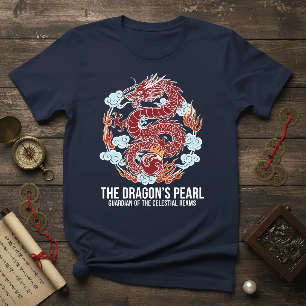 Step into a world of ancient legends and breathtaking fantasy with this captivating t-shirt. The intricate artwork features a magnificent red dragon, coiled protectively around a luminous pearl, symbolizing power, wisdom, and cosmic balance. Surrounded by swirling clouds and vibrant flames, the dragon embodies its role as the guardian of the celestial realms, a protector of the divine and the mystical. This design is a tribute to the rich tapestry of dragon lore found across cultures and throughout history.