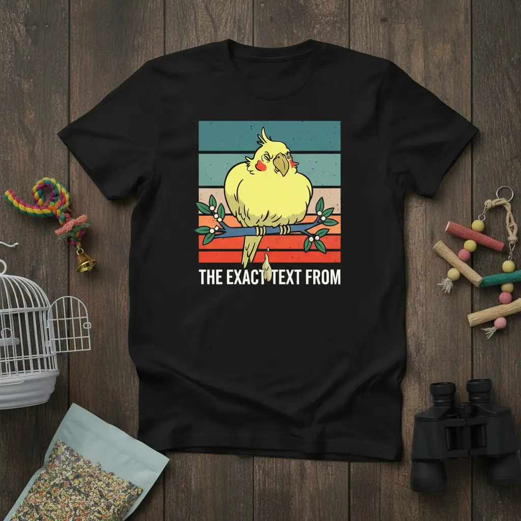 Showcasing your love for your avian companions has never been more fun. This “The Exact Text From” t-shirt is designed for the discerning bird lover who appreciates a bit of humor and a lot of personality. The intricate design features a beautifully illustrated cockatiel, known for its cheerful disposition and striking yellow plumage. It’s more than just a shirt; it’s a declaration of your bond with your pet bird.