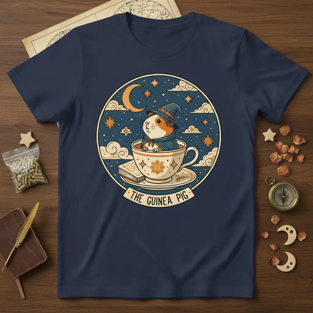 Every element of this design is crafted to appeal to guinea pig enthusiasts. The intricate details on the teacup and the starry sky are rendered in a delightful, vintage-inspired style. It’s a piece of wearable art that celebrates the special bond between owners and their guinea pigs, making it a cherished item.