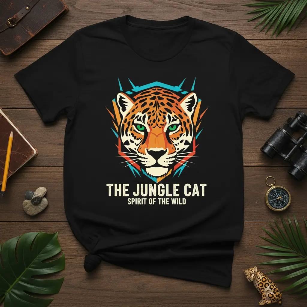 This t-shirt proudly displays the bold text “THE JUNGLE CAT” above “SPIRIT OF THE WILD,” set against a captivating, stylized graphic of a jaguar’s face. The vibrant colors and sharp lines of the artwork evoke the intensity and mystery of the jungle. It’s a design that speaks to the primal instincts and the inherent beauty found in the wild kingdom. This piece is perfect for making a statement and showing off your admiration for these incredible felines.