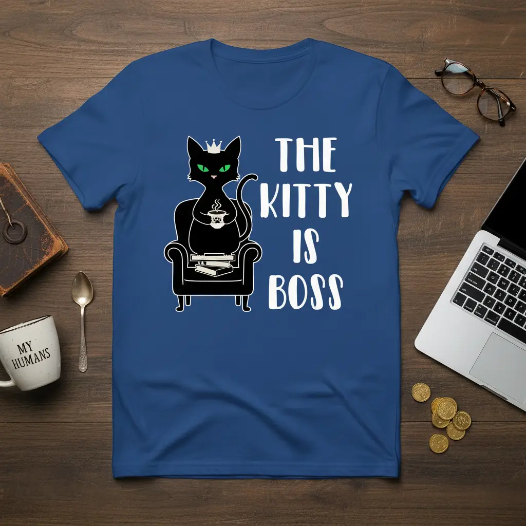 This design boldly proclaims “THE KITTY IS BOSS” in eye-catching typography, making it a statement piece for any cat lover’s wardrobe. The accompanying graphic features a sophisticated black cat, adorned with a crown, exuding an air of authority while enjoying a warm cup of coffee. This visual representation perfectly encapsulates the regal and commanding presence our feline friends often possess. It’s a humorous yet accurate portrayal that will surely bring a smile to fellow cat aficionados.