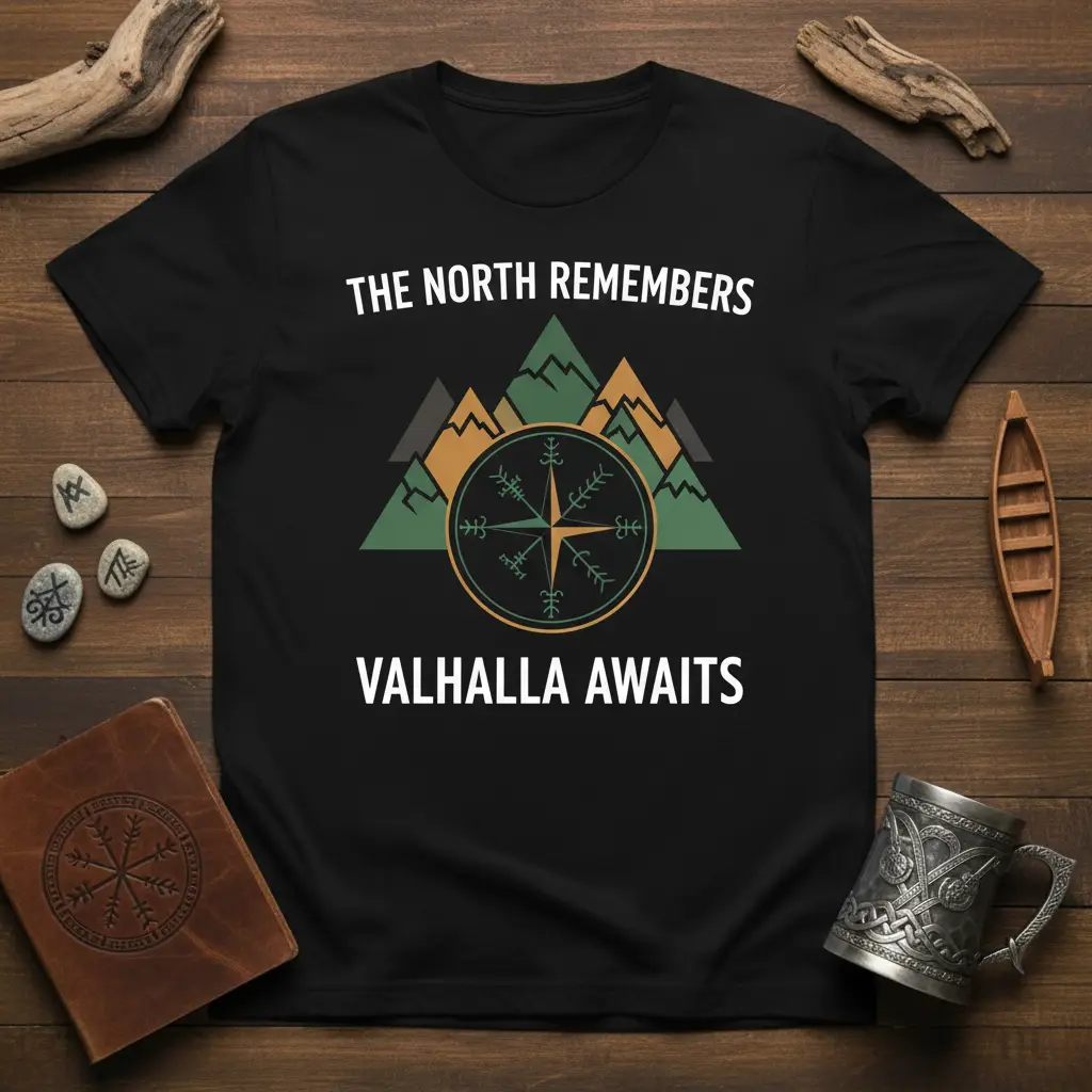 The intricate details of the compass, reminiscent of ancient navigational tools, coupled with the rugged mountain landscape, create a visually stunning representation of the Viking spirit. This THE NORTH REMEMBERS VALHALLA AWAITS design is ideal for anyone who feels a connection to Norse history, its rich lore, and the indomitable spirit of its people. Wear it and carry the legend with you.