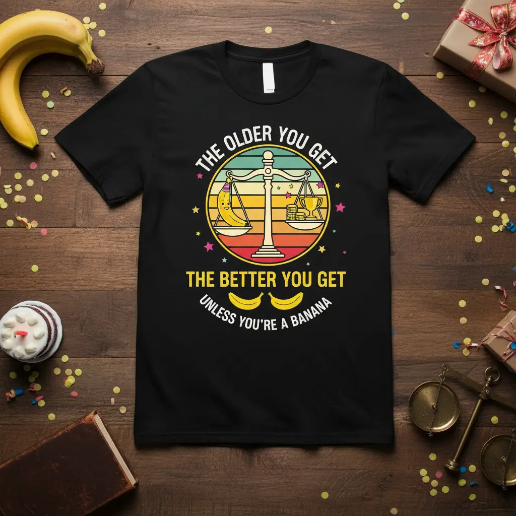 This eye-catching t-shirt features the full quote “The Older You Get The Better You Get Unless You’re A Banana,” making it a standout piece for any wardrobe. The design incorporates a charming graphic of scales, with a smiling banana on one side and coins and a trophy on the other, visually representing the saying. It’s a delightful way to express your sense of humor and perhaps your affinity for this beloved fruit.